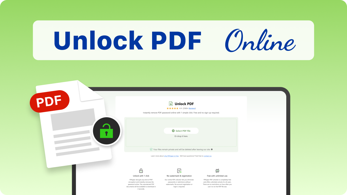 PDFgear decrypts any kind of PDF encryption and instantly removes the password online. The unprotected PDF documents will be available to download in 2 seconds.