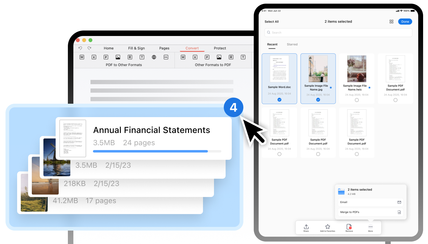 Easily merge multiple JPEGs, PNGs, or PDFs into a single PDF with PDFgear's batch PDF merge feature. Streamline the process with a few simple clicks.