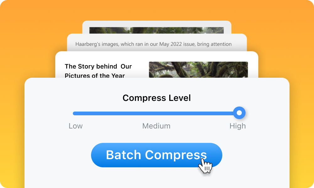 Reduce the size of large PDF business document collections to save device storage, time, and effort. Customize compression modes for each PDF based on file sizes.
