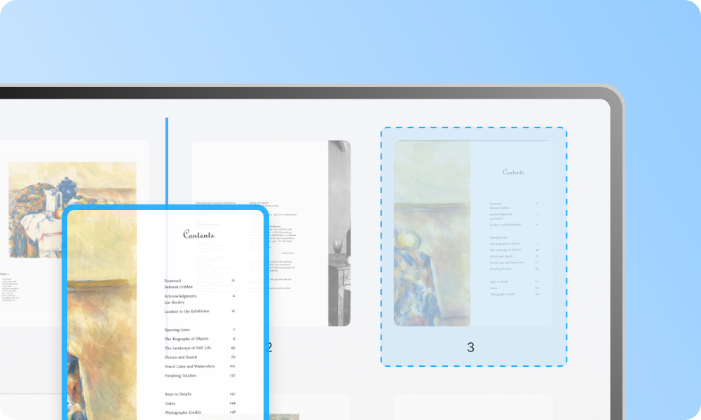 PDFgear displays each page of a PDF as thumbnails with page numbers, allowing you to quickly and easily rearrange the order of the pages by simply dragging and dropping them.