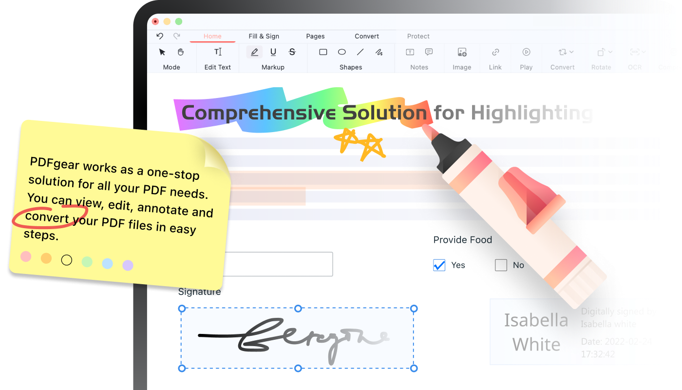 Aside from highlighting text and areas in PDFs, PDFgear for Desktop & Mobile provides a plethora of annotation options including annotations, comments, electronic signatures, shapes, etc.