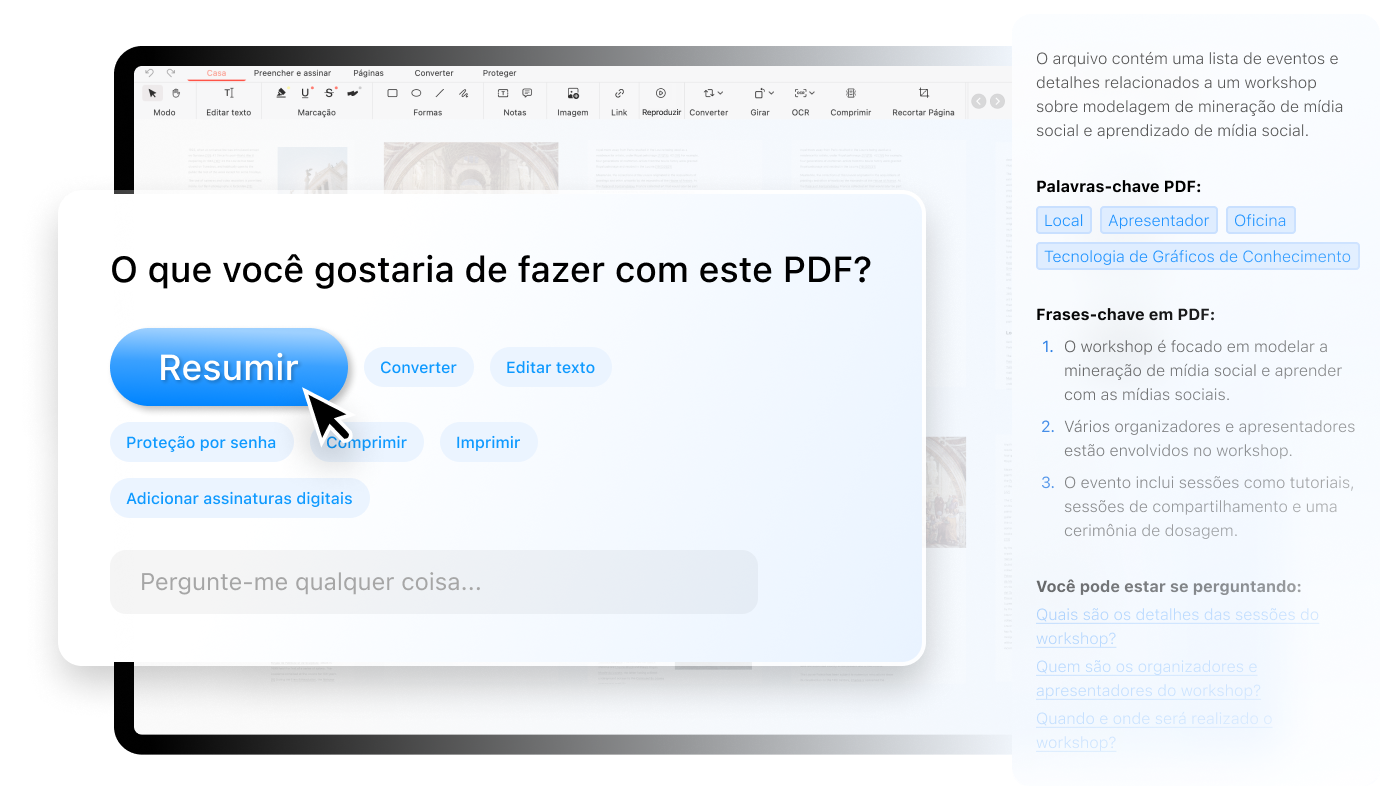 Compreenda melhor os seus PDFs rapidamente, fazendo perguntas diretamente no PDFgear, e você vai obter respostas precisas. Além disso, o PDFgear Chatbot irá gerar automaticamente 3 sugestões de perguntas para o seu PDF.
